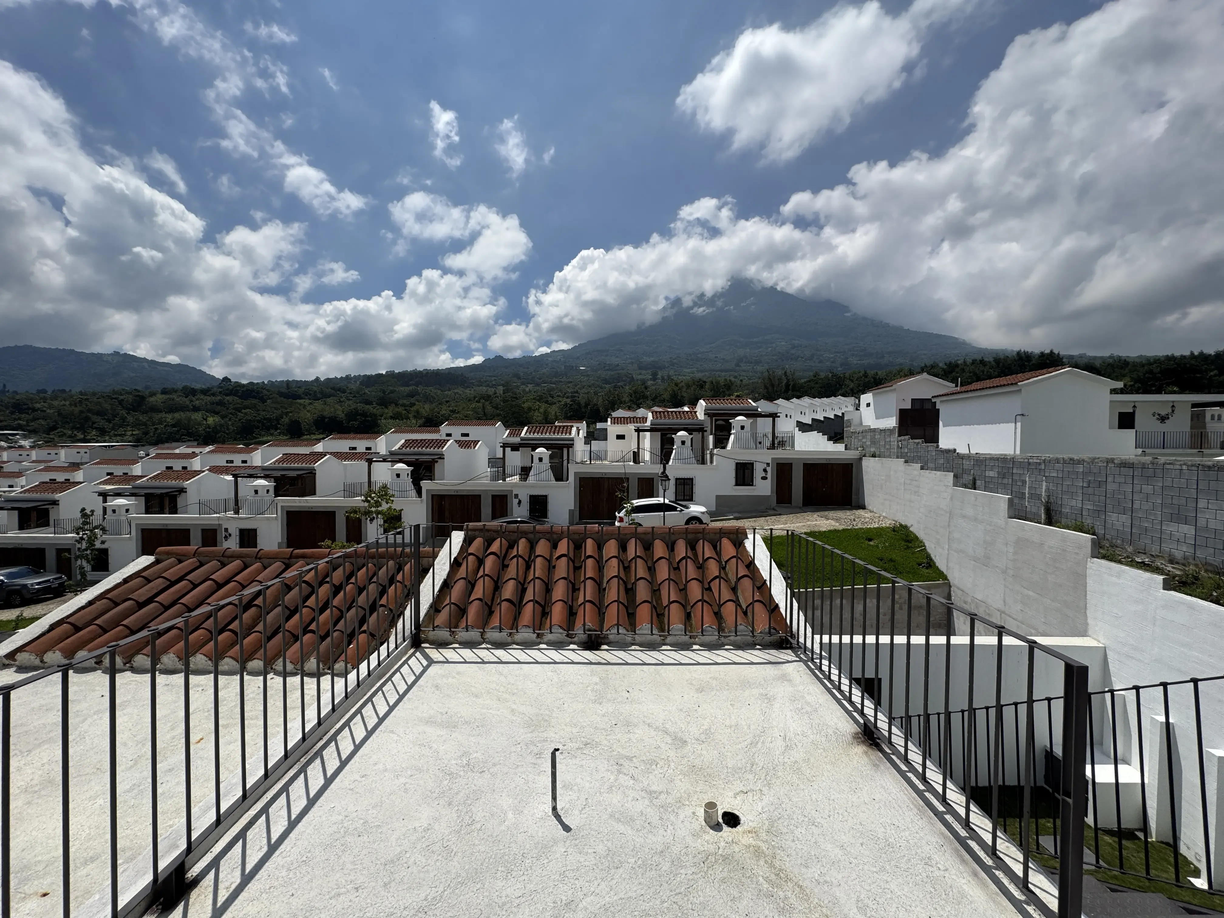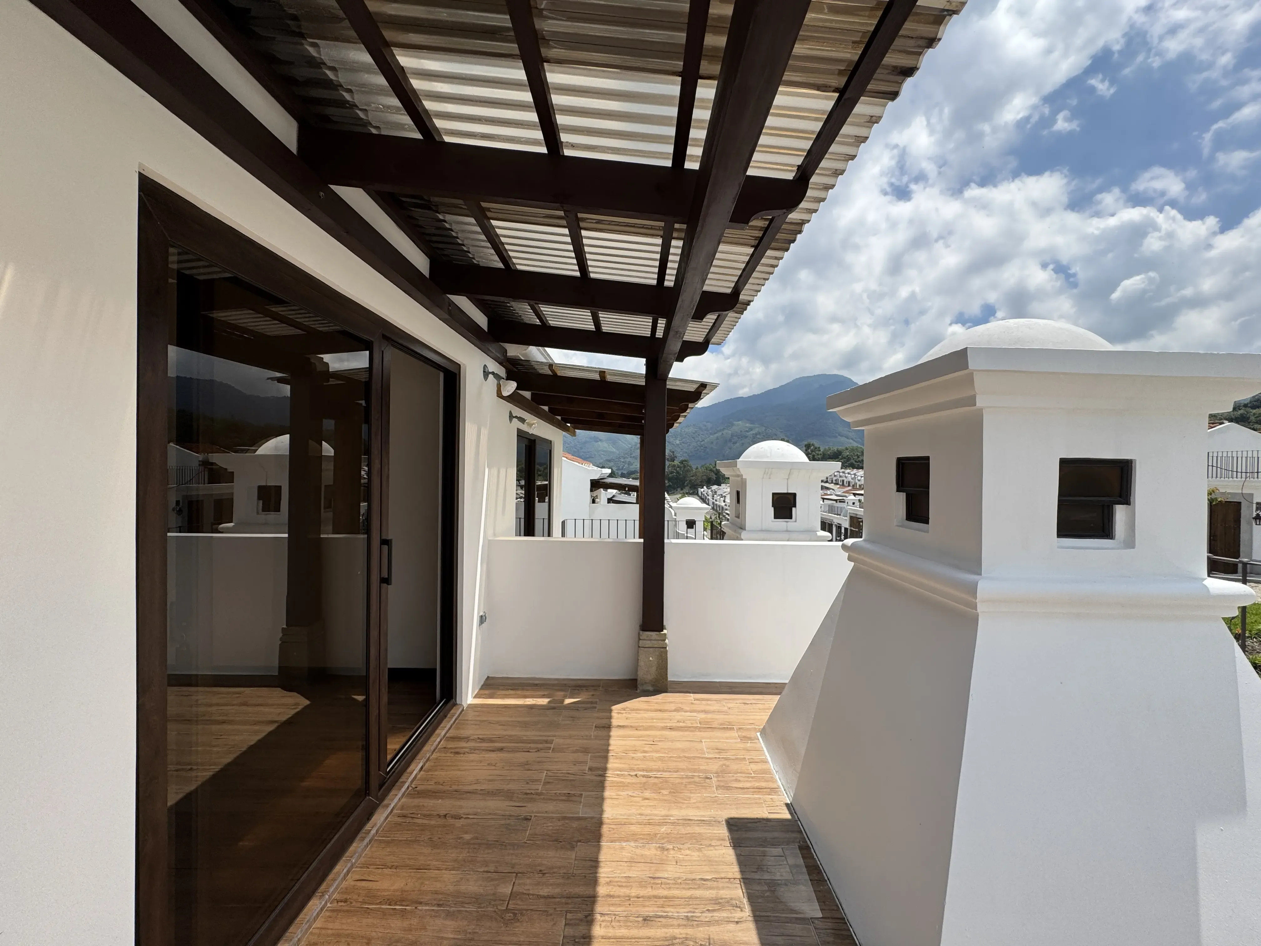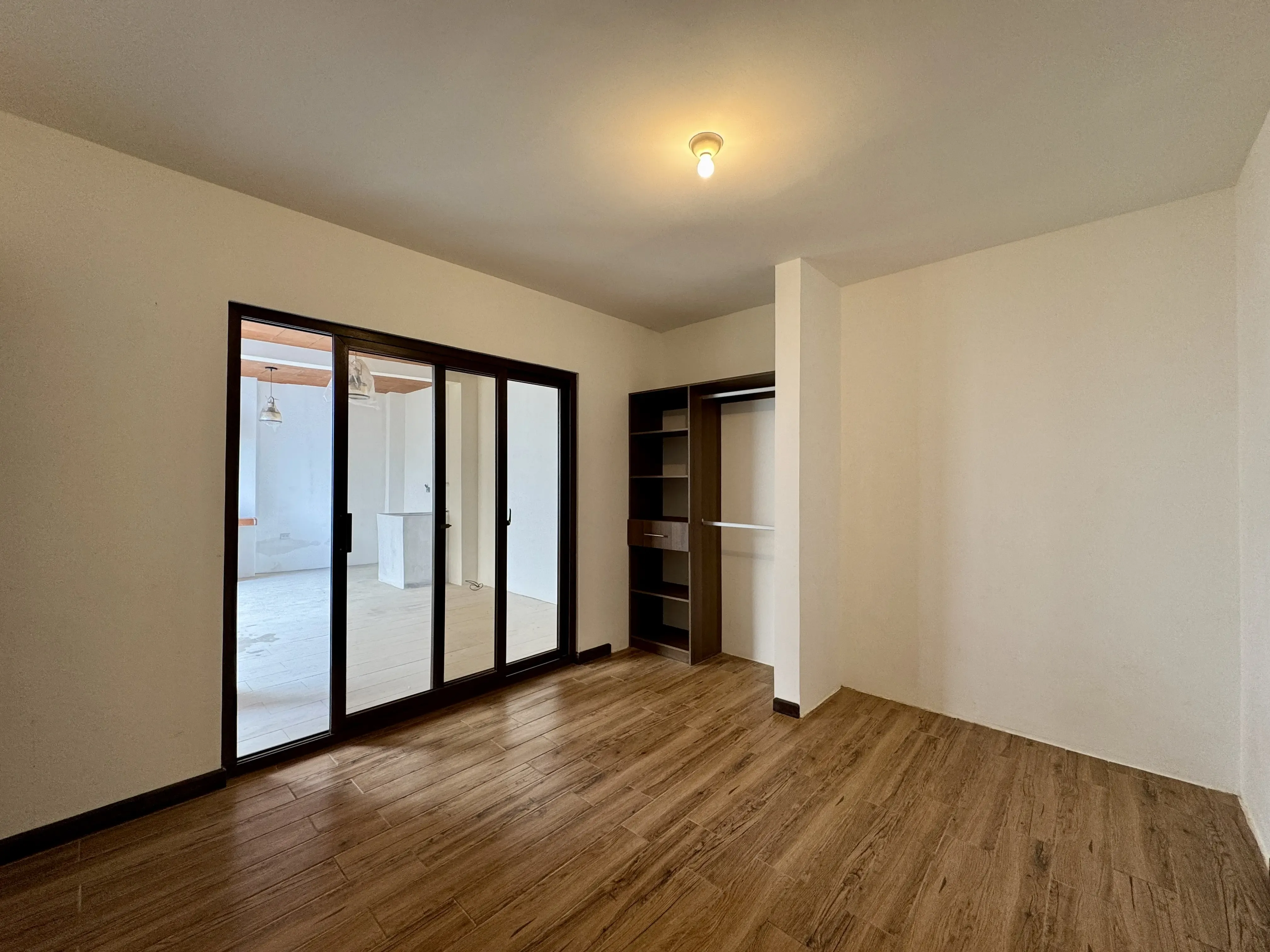 • Dormitorio principal con walk-in closet, baño y acceso a terraza con vistas espectaculares hacia los volcanes de Fuego, Agua y hacia el valle