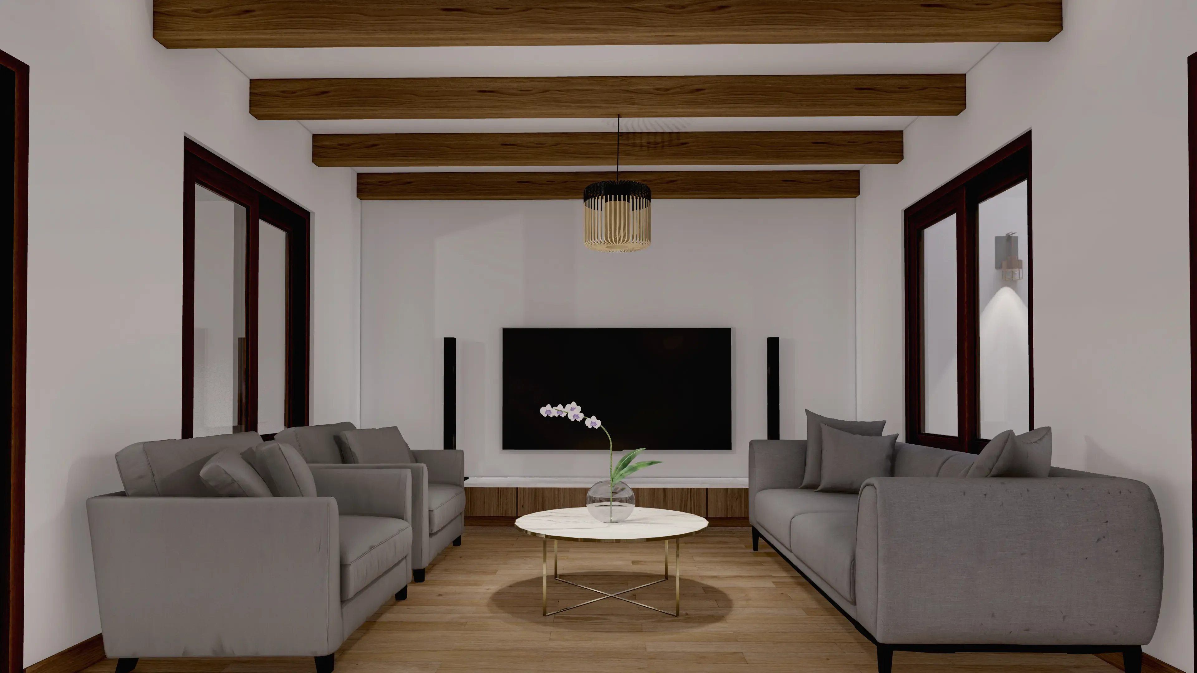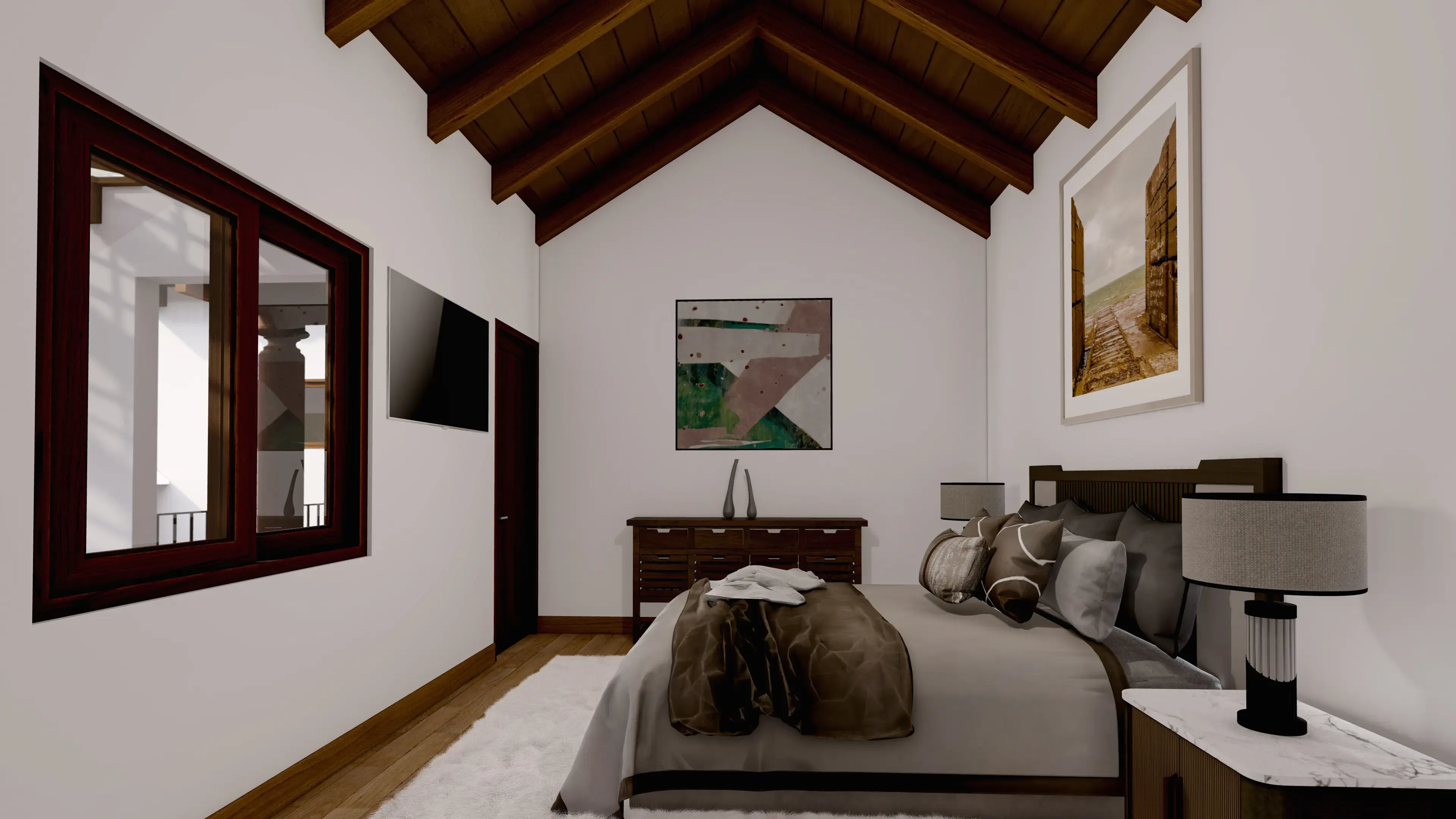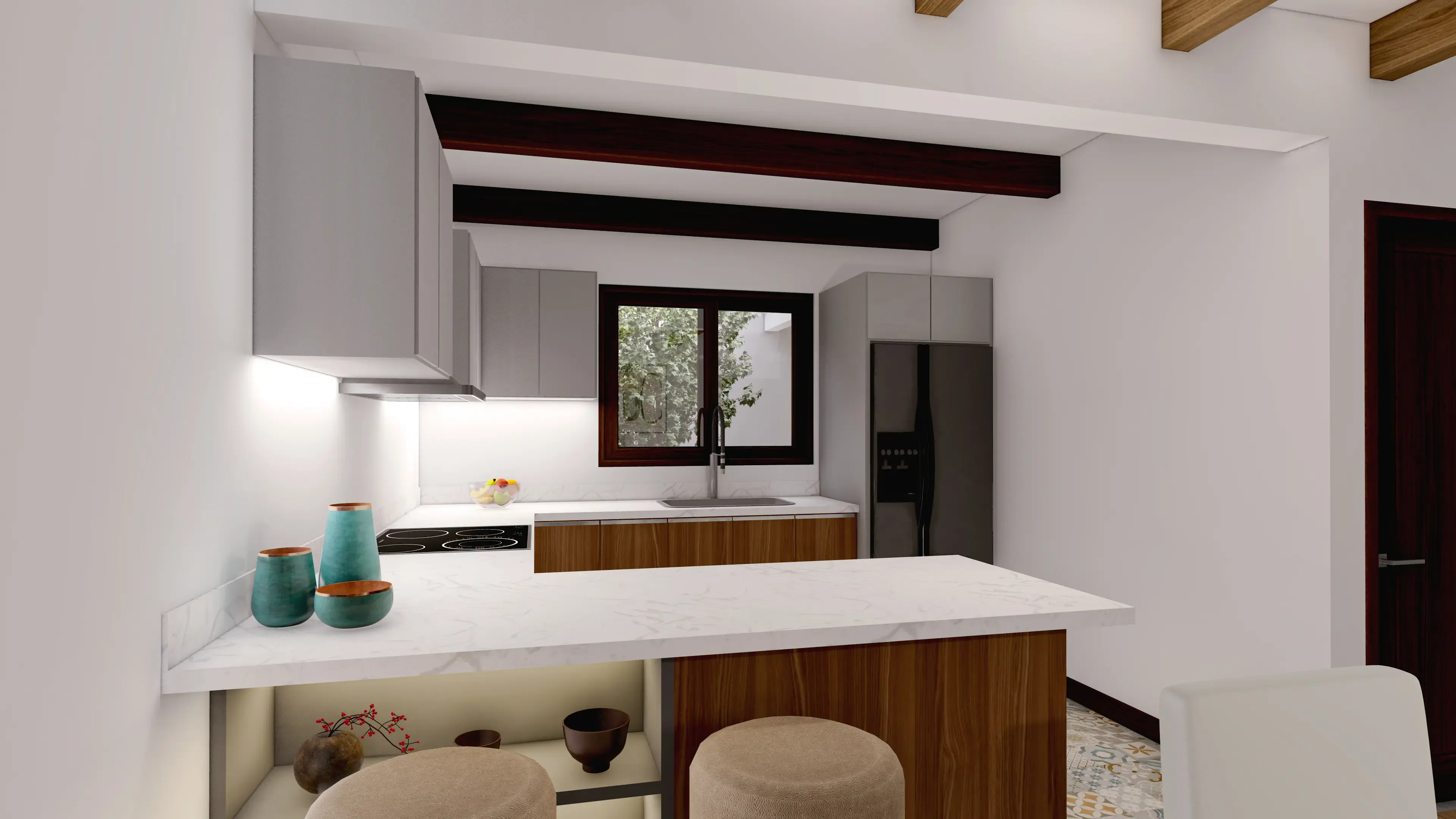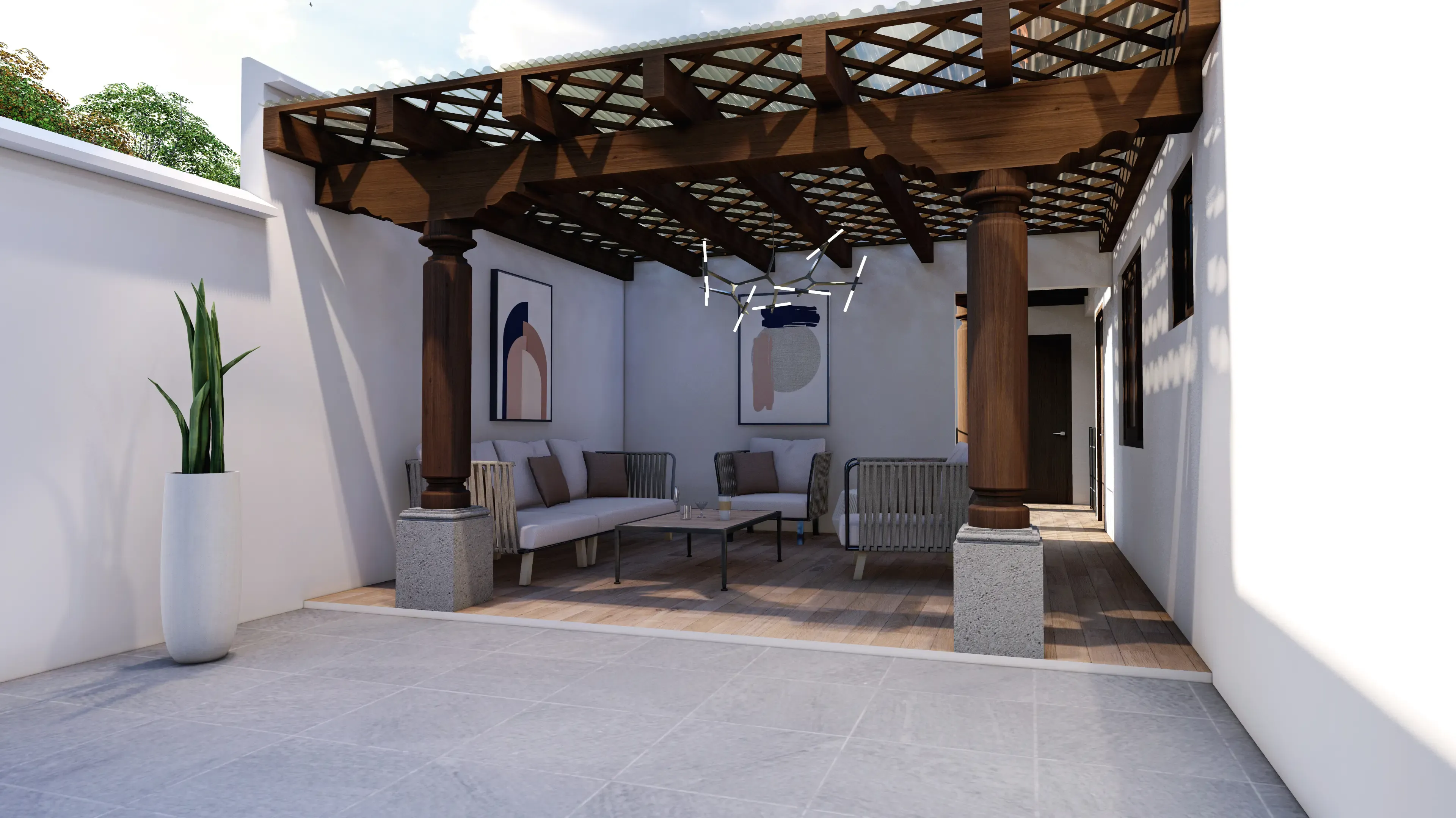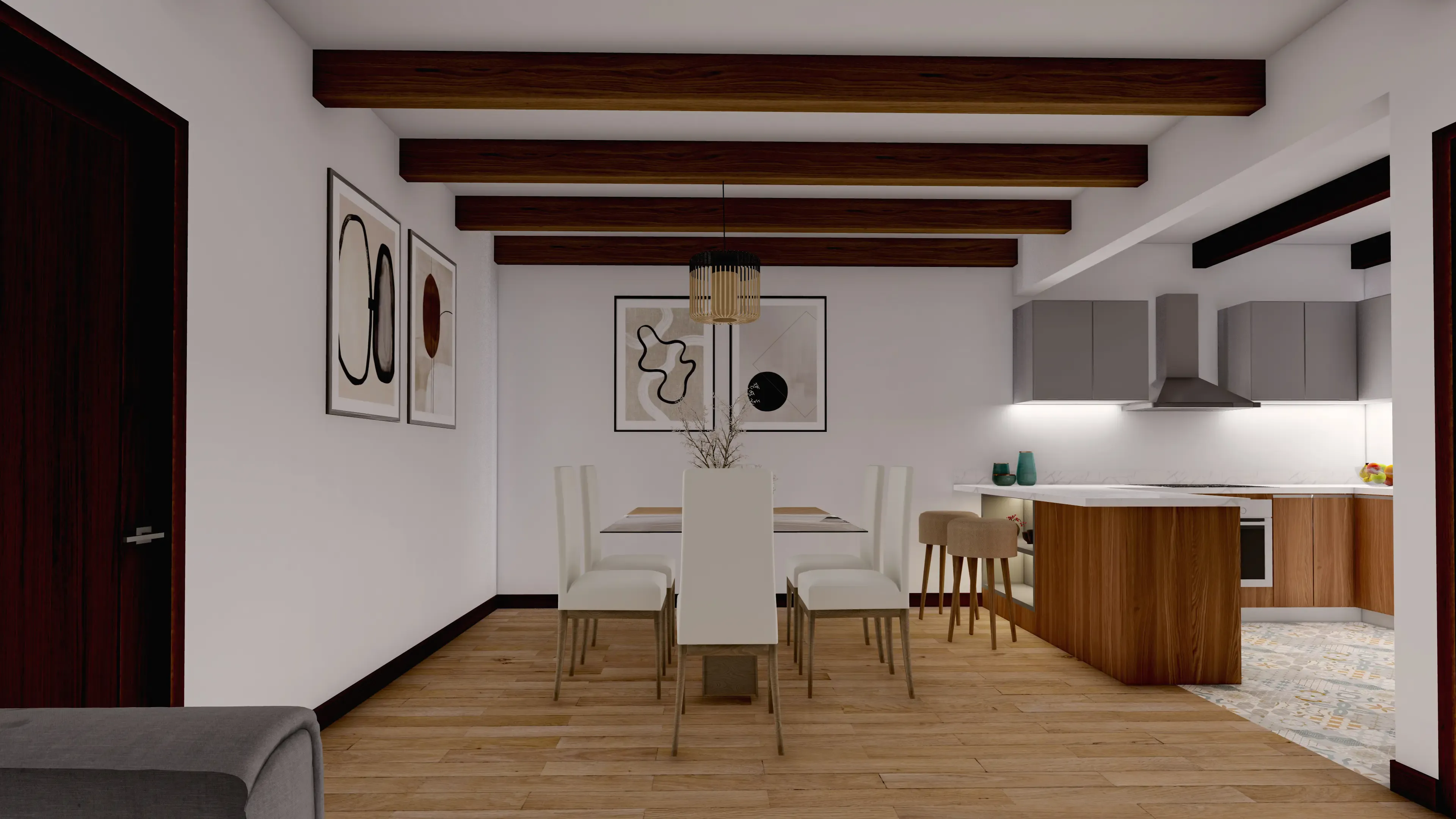 - Acabados en madera: Sobresaldrán vigas decorativas de madera en el área social y techos de madera en los dormitorios.