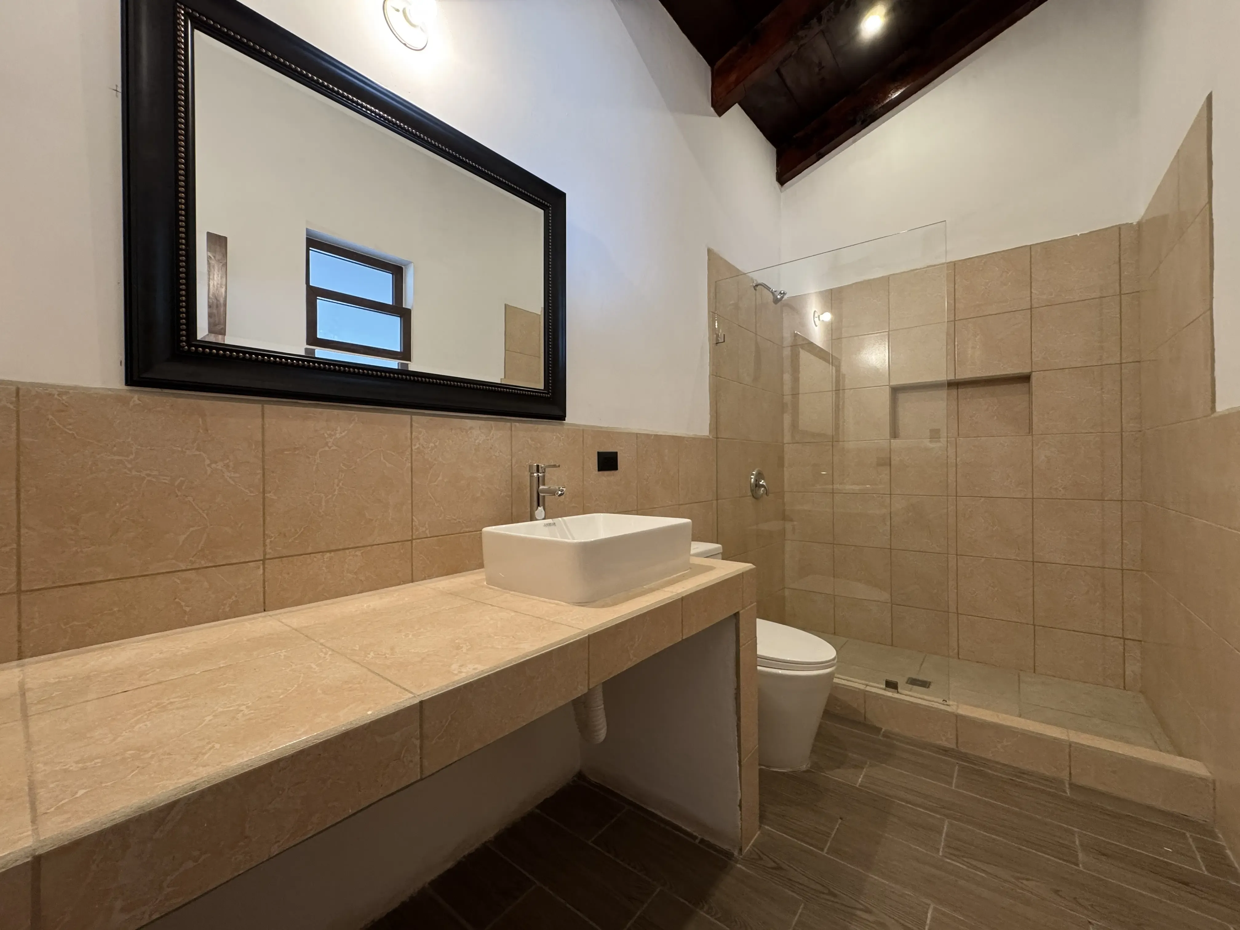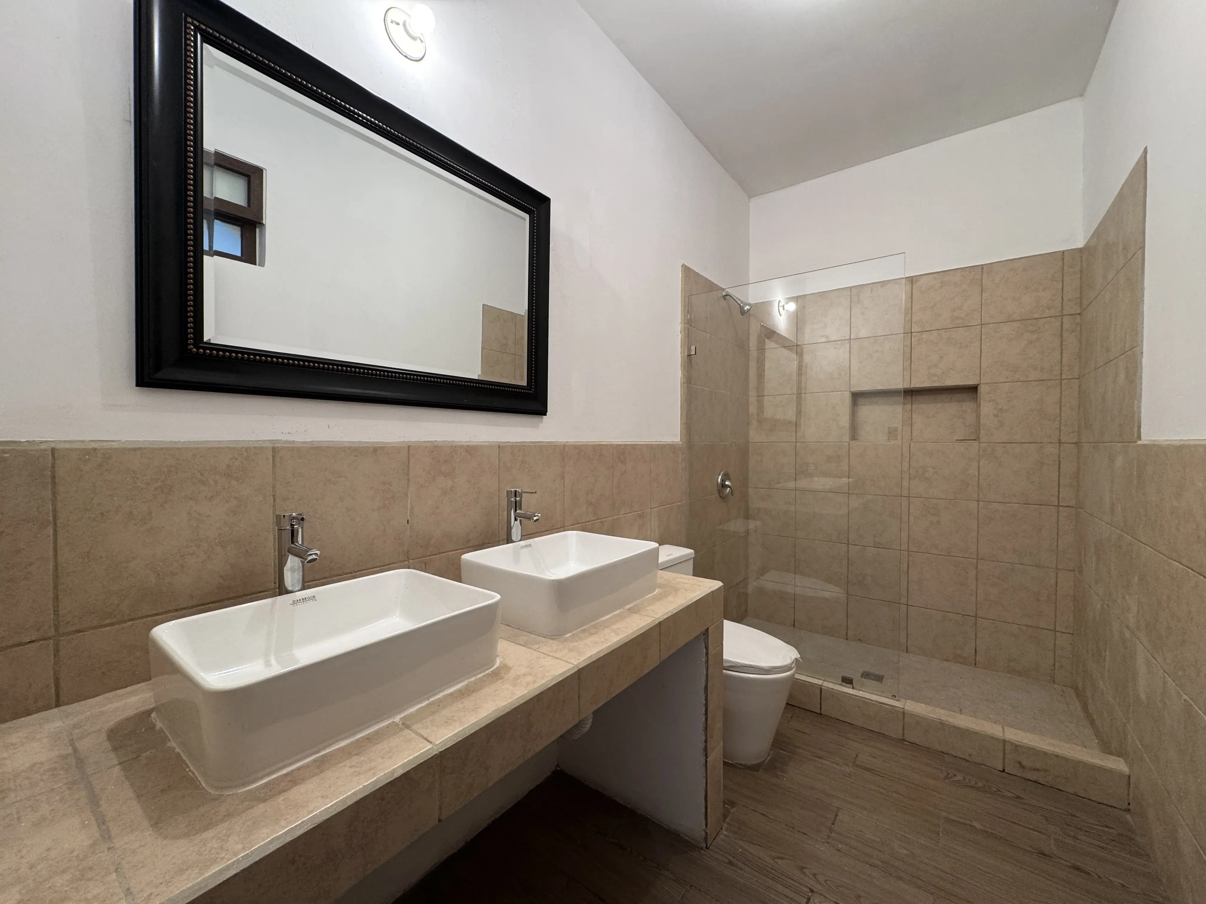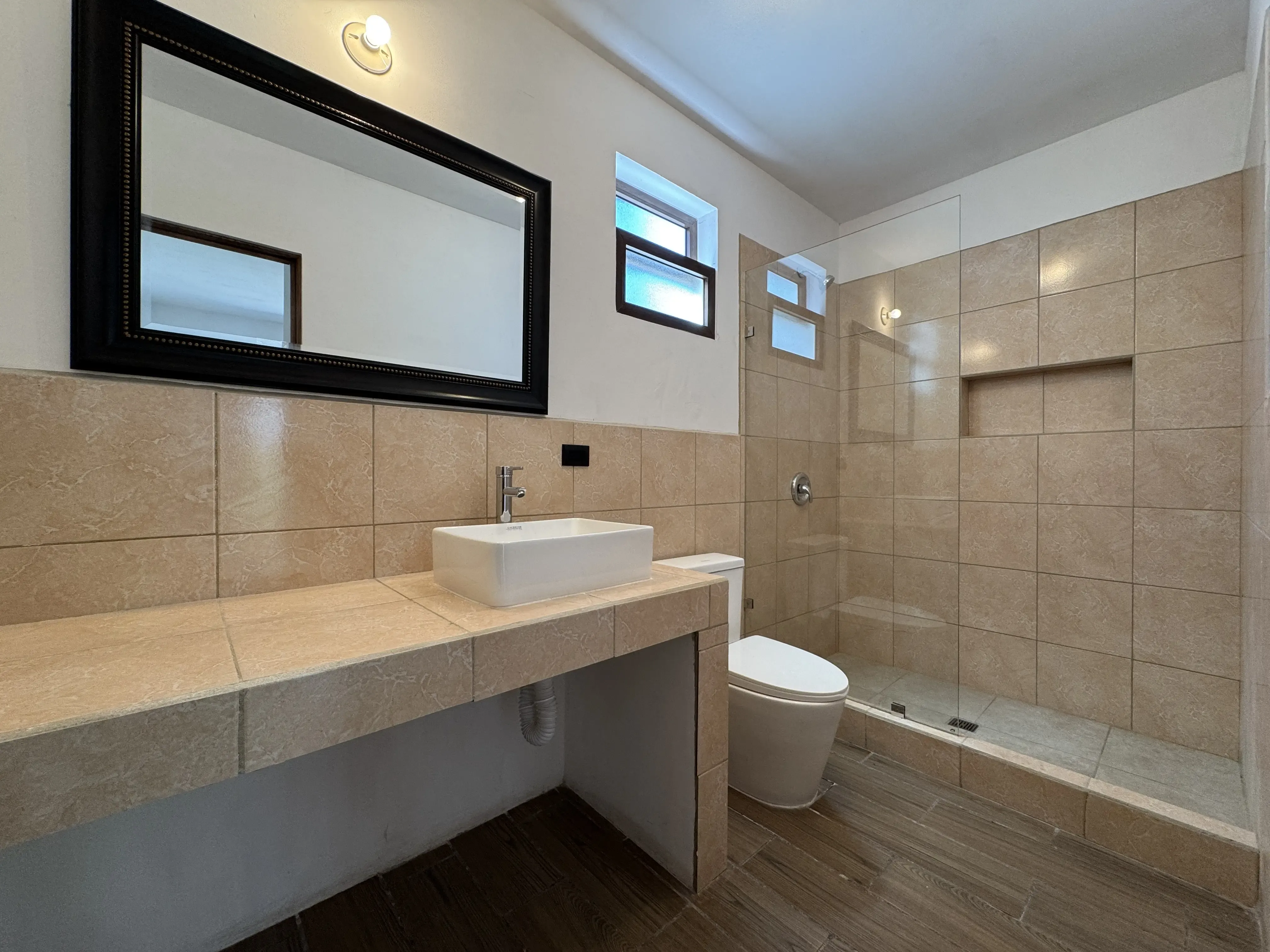 - Baños modernos: Lavamanos en top cerámico, mamparas de vidrio templado en duchas.