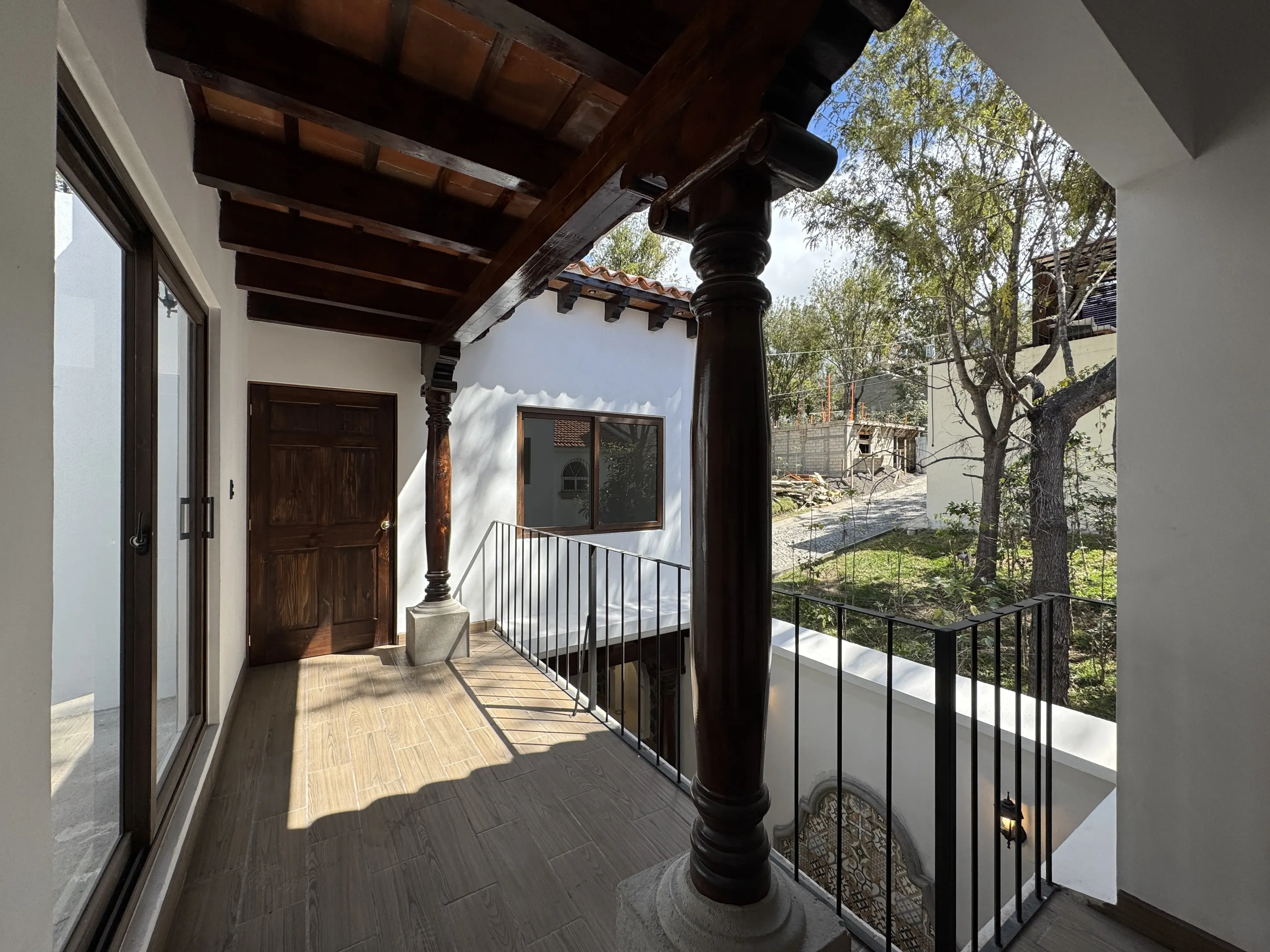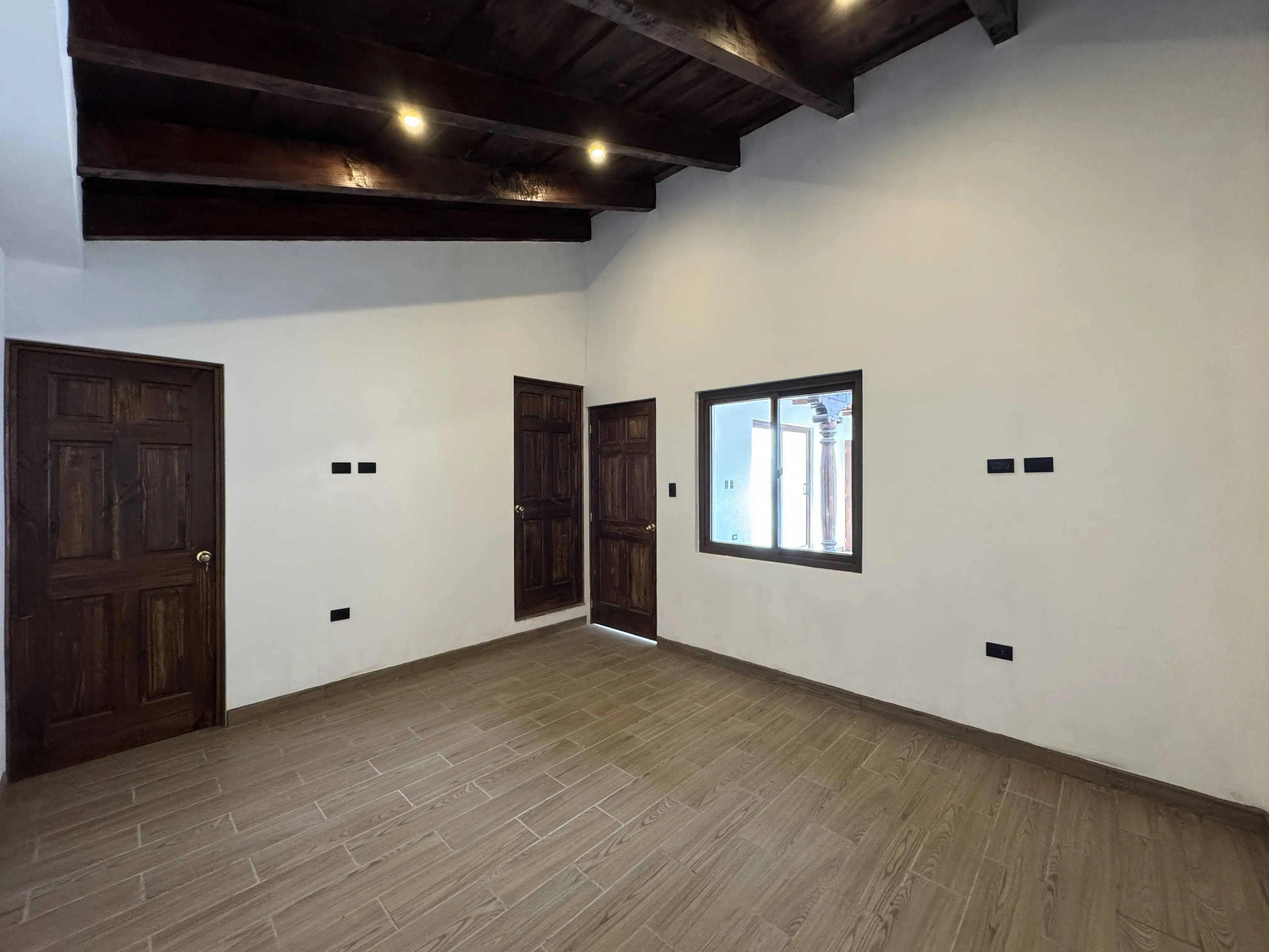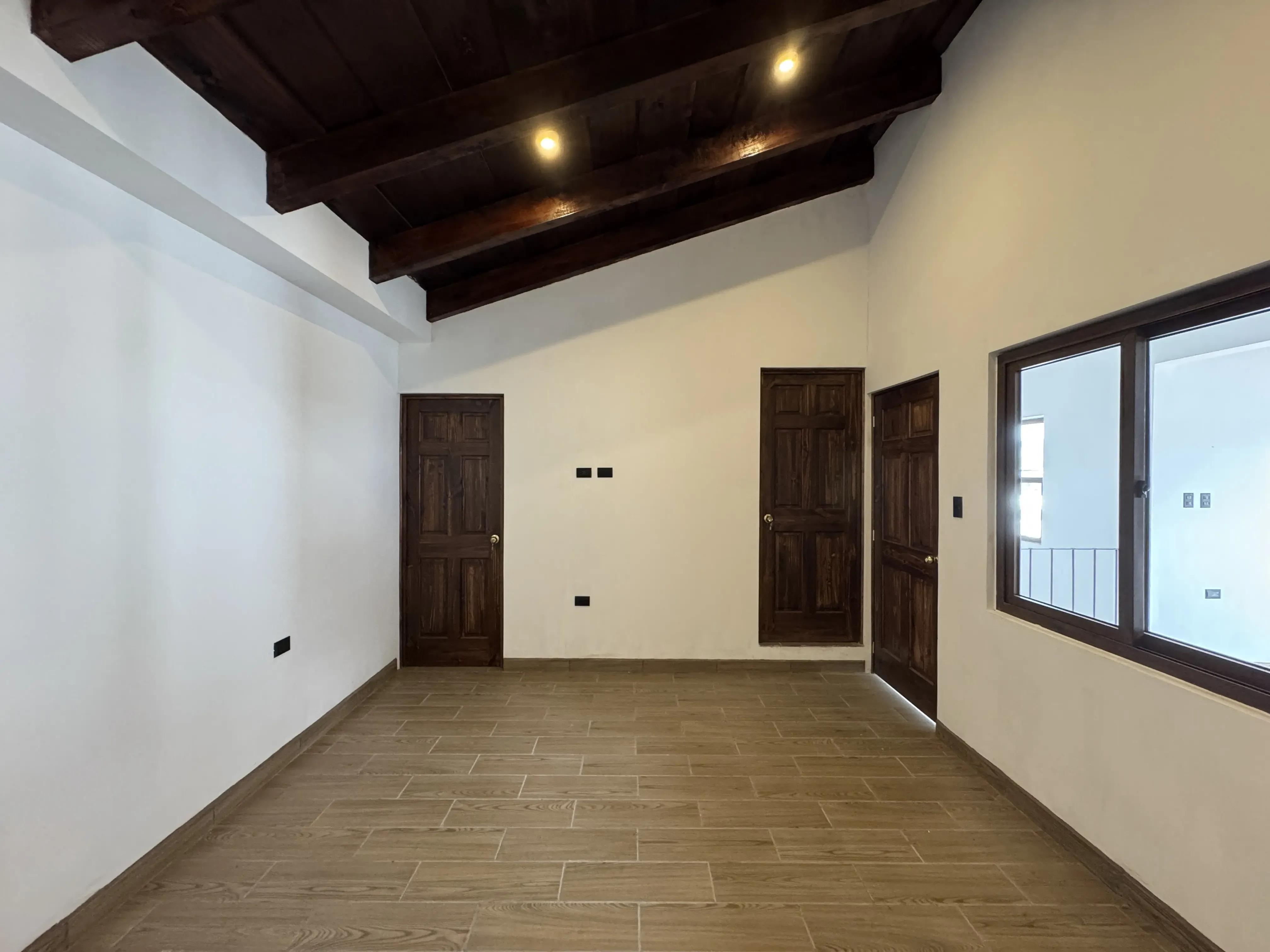 - Acabados en madera: Vigas decorativas en techos de áreas sociales, puertas de madera sólida.