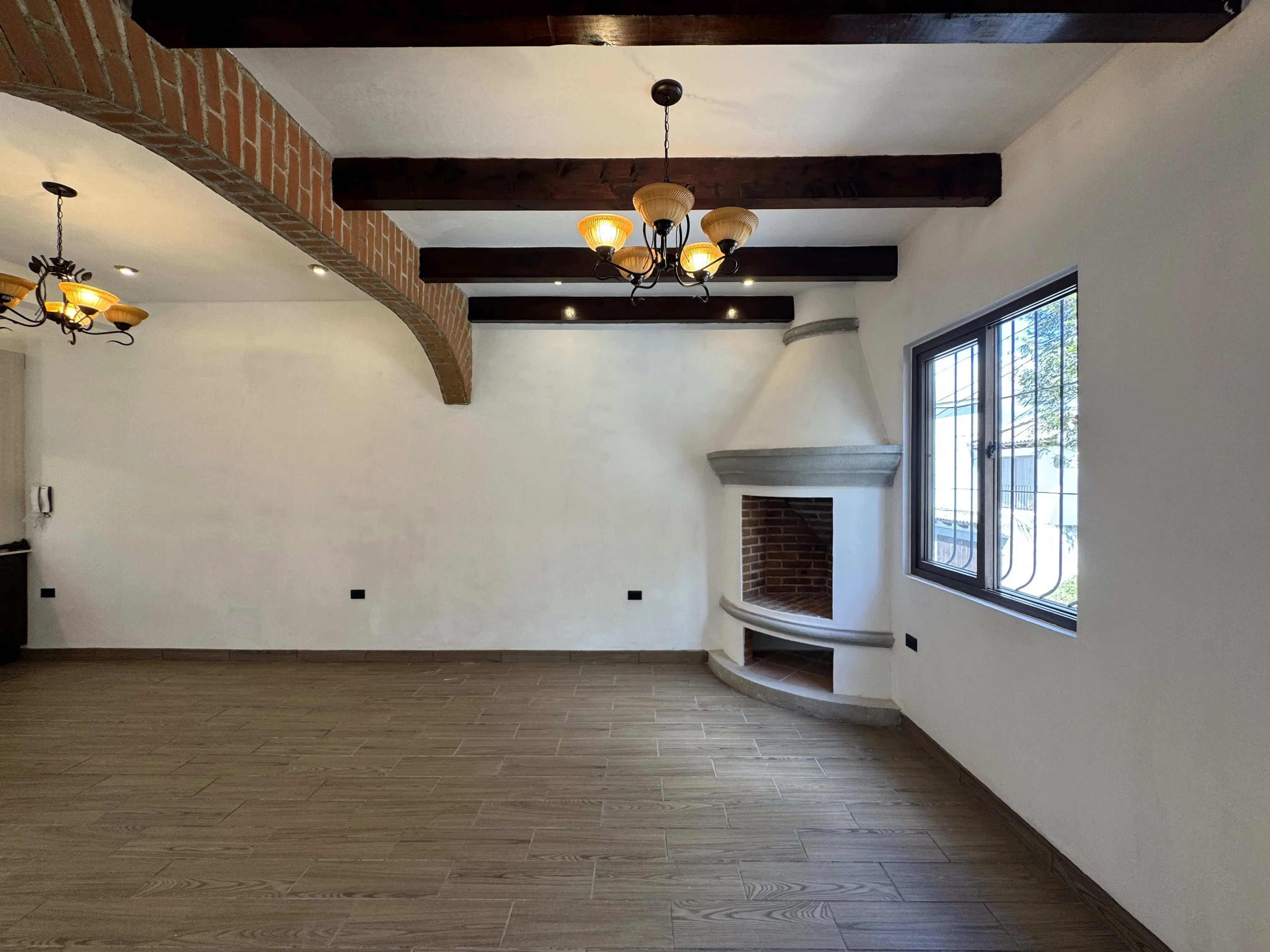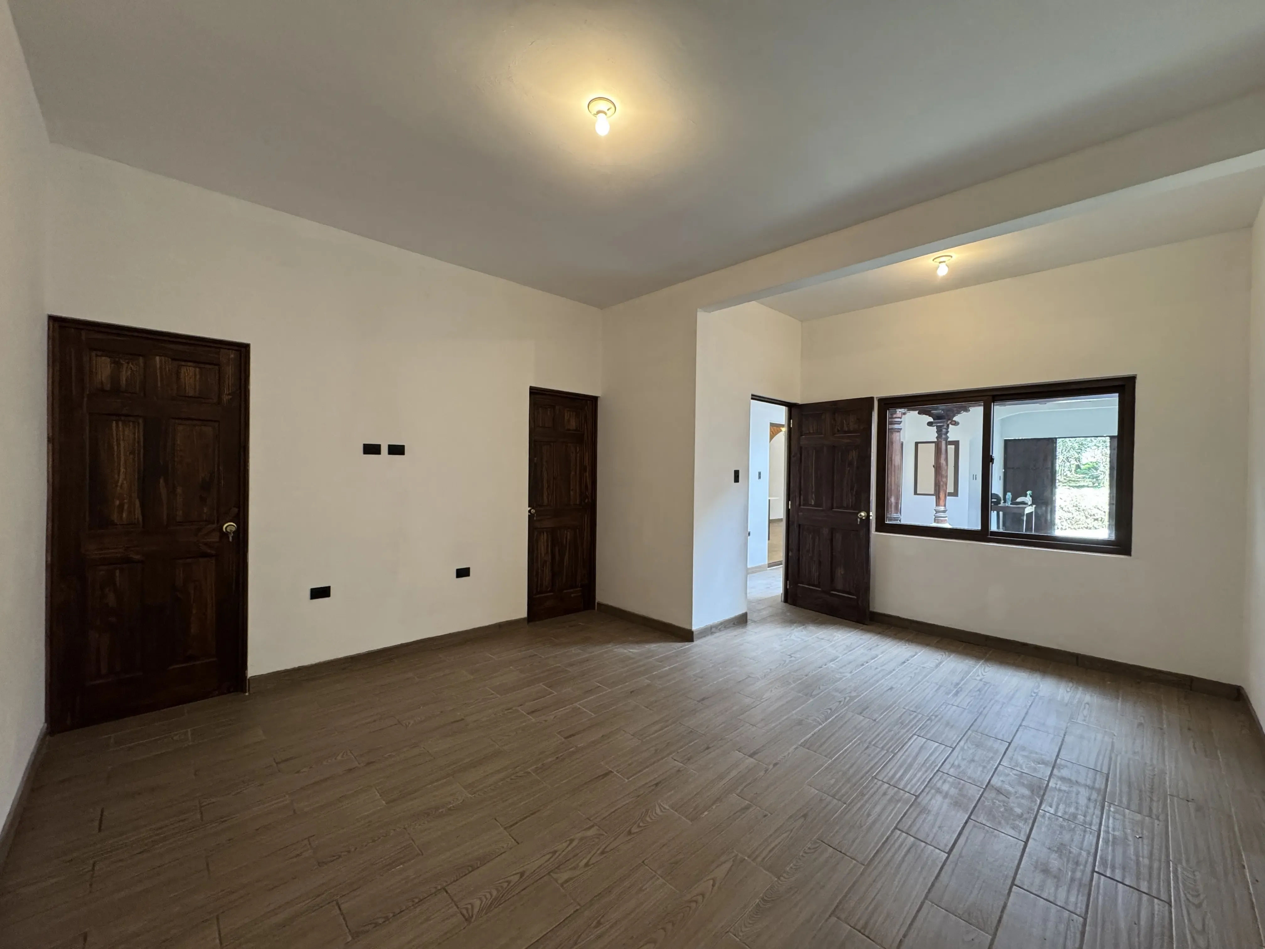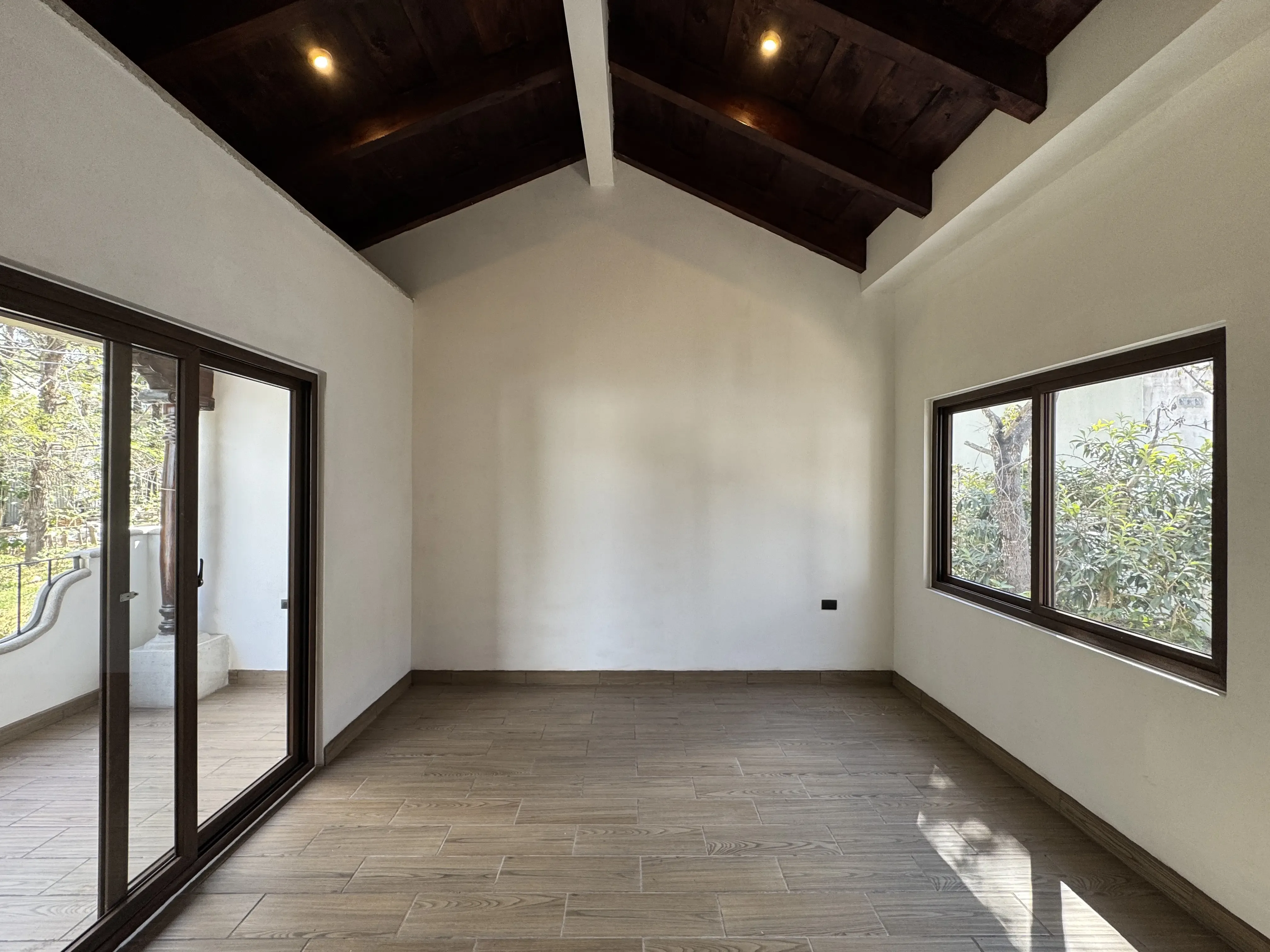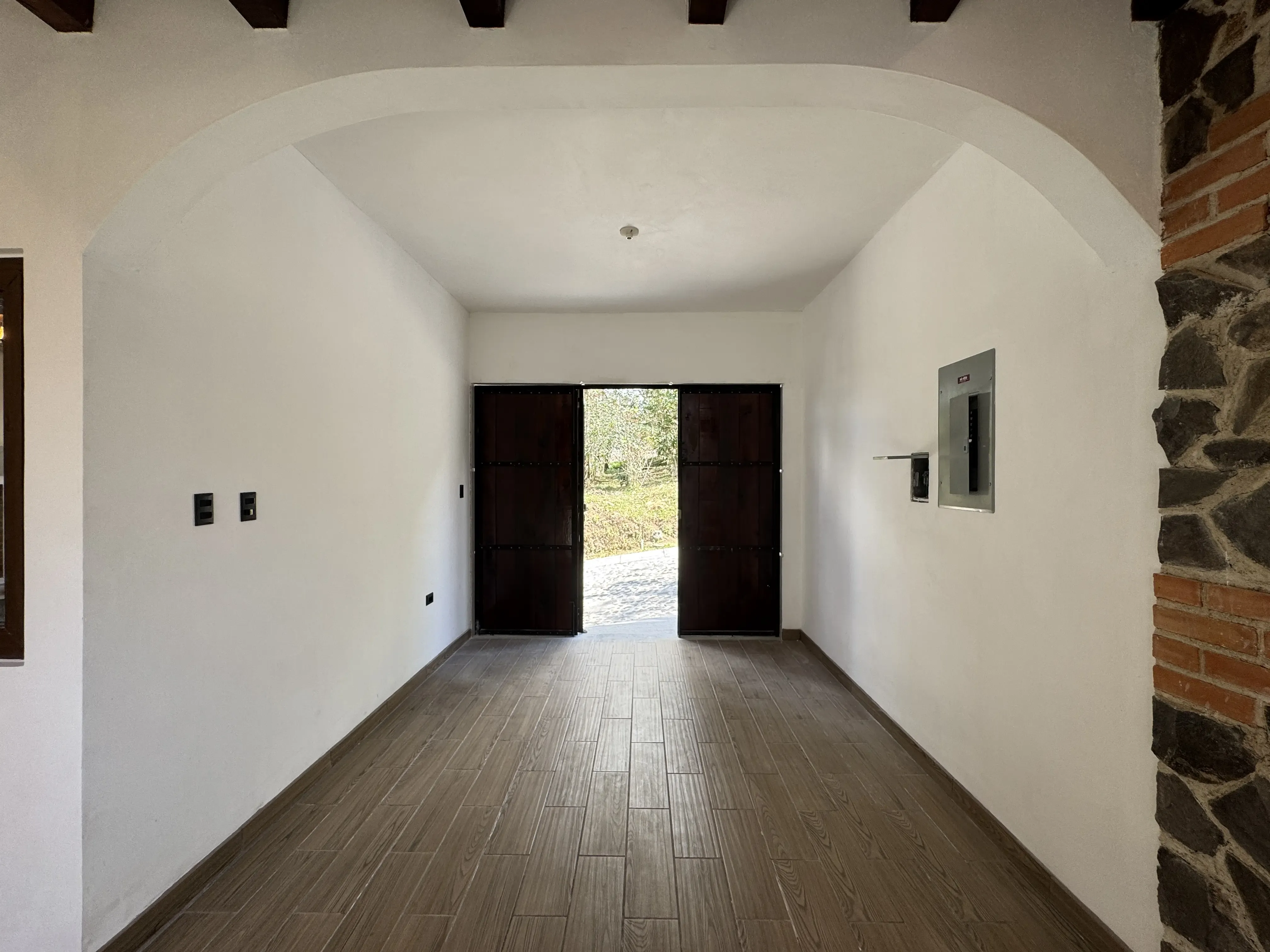 - Acabados en madera: Vigas decorativas en techos de áreas sociales, puertas de madera sólida.
