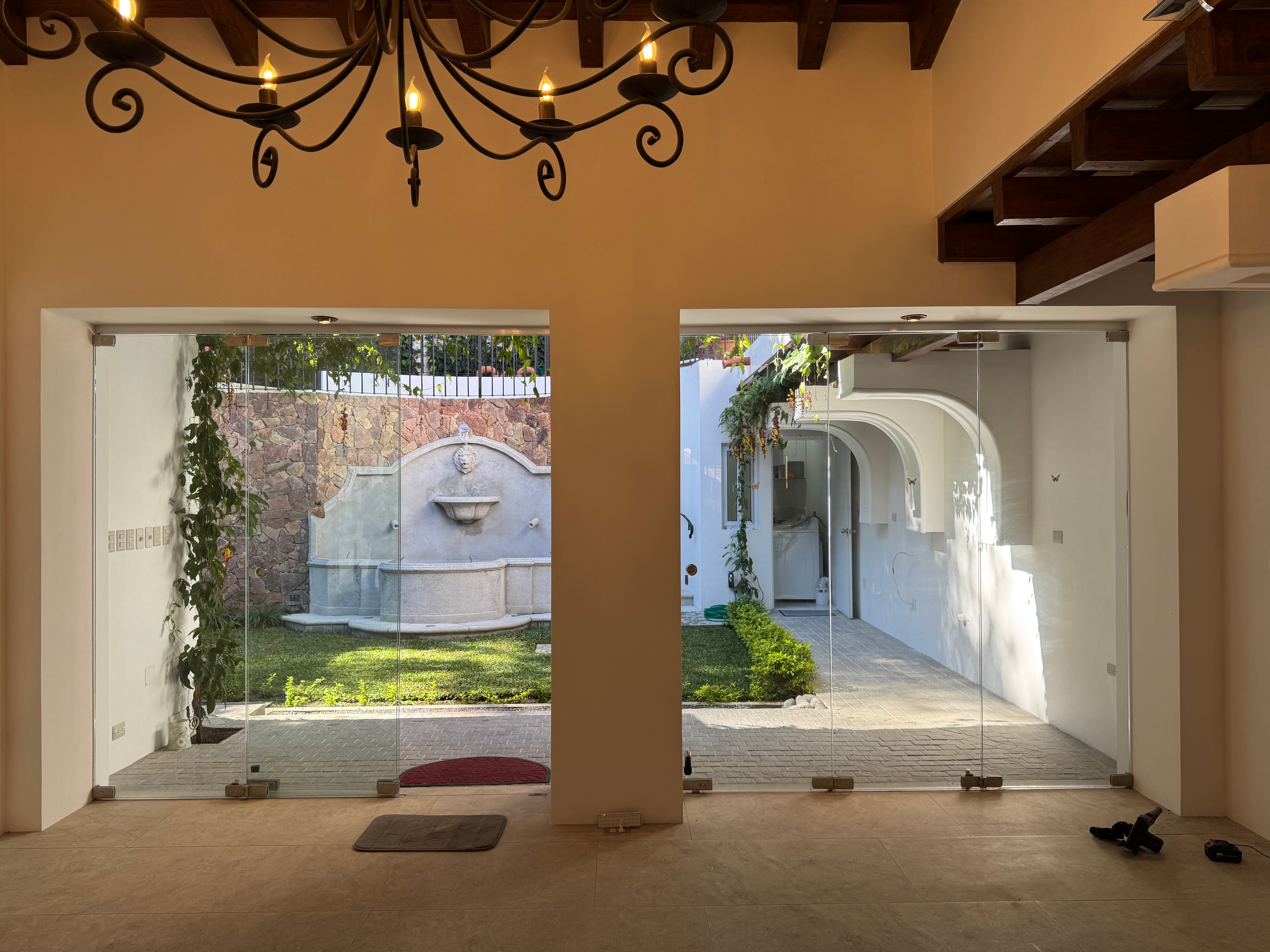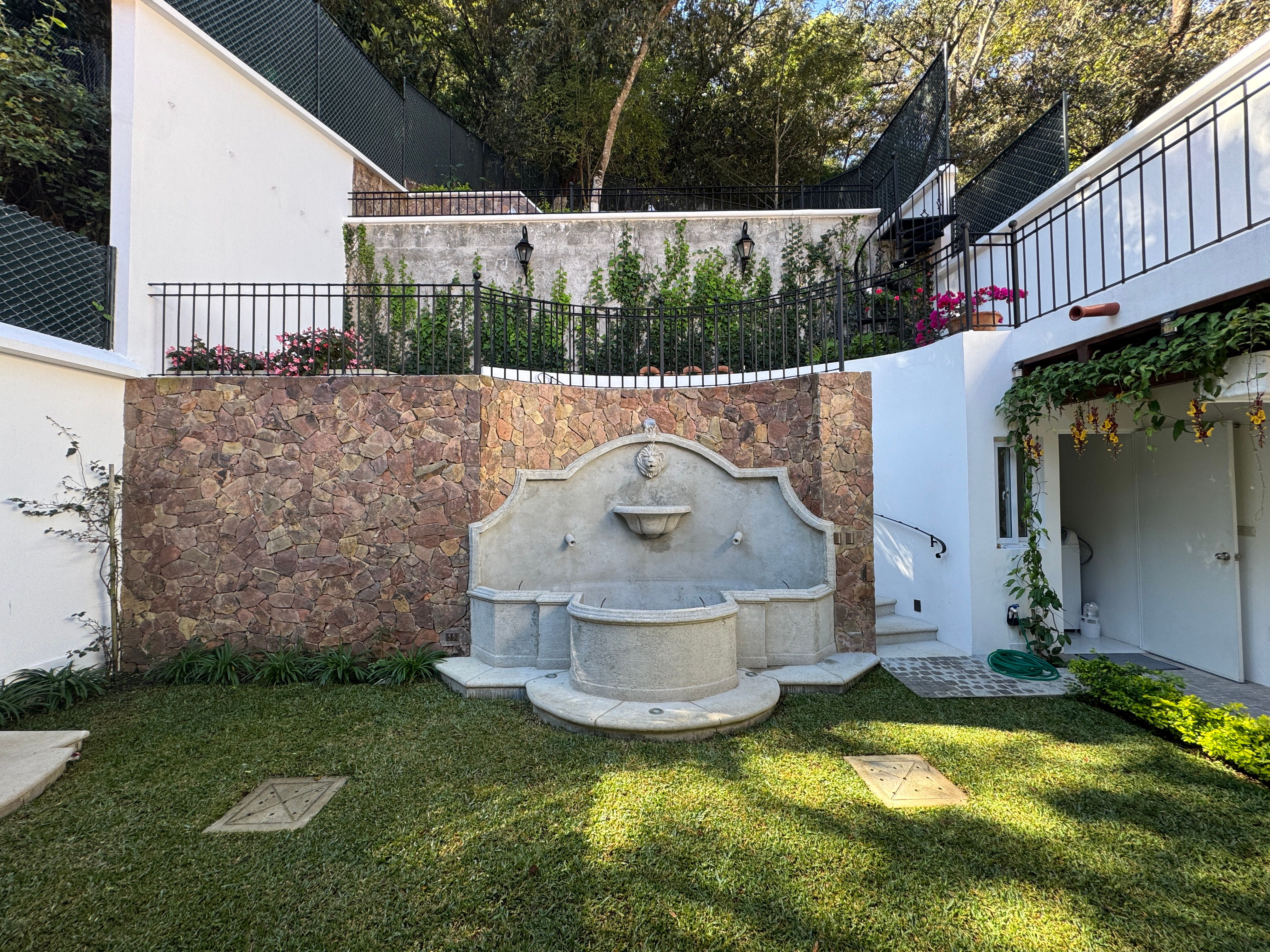 • Iluminación: Lamparas de hierro forjado en todos los ambientes, luces LED en toda la propiedad, lámparas de emergencia en gradas, pasillos y sala, luces de fachada con temporizador, jardines con iluminación LED y lámparas de hierro forjado.