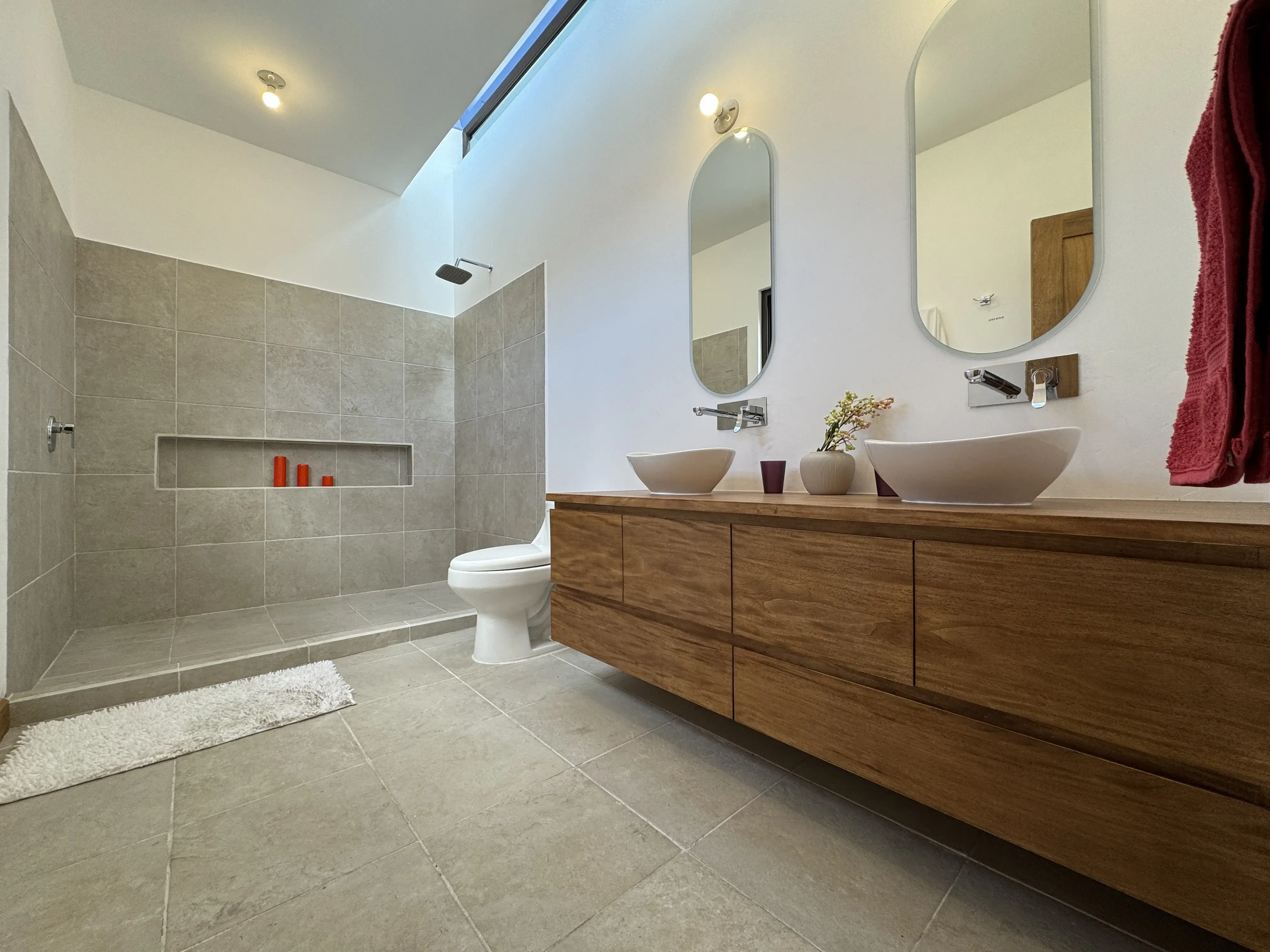 - Baños: Muebles de madera diseñados para ser decorativos y útiles, con lavabos modernos.