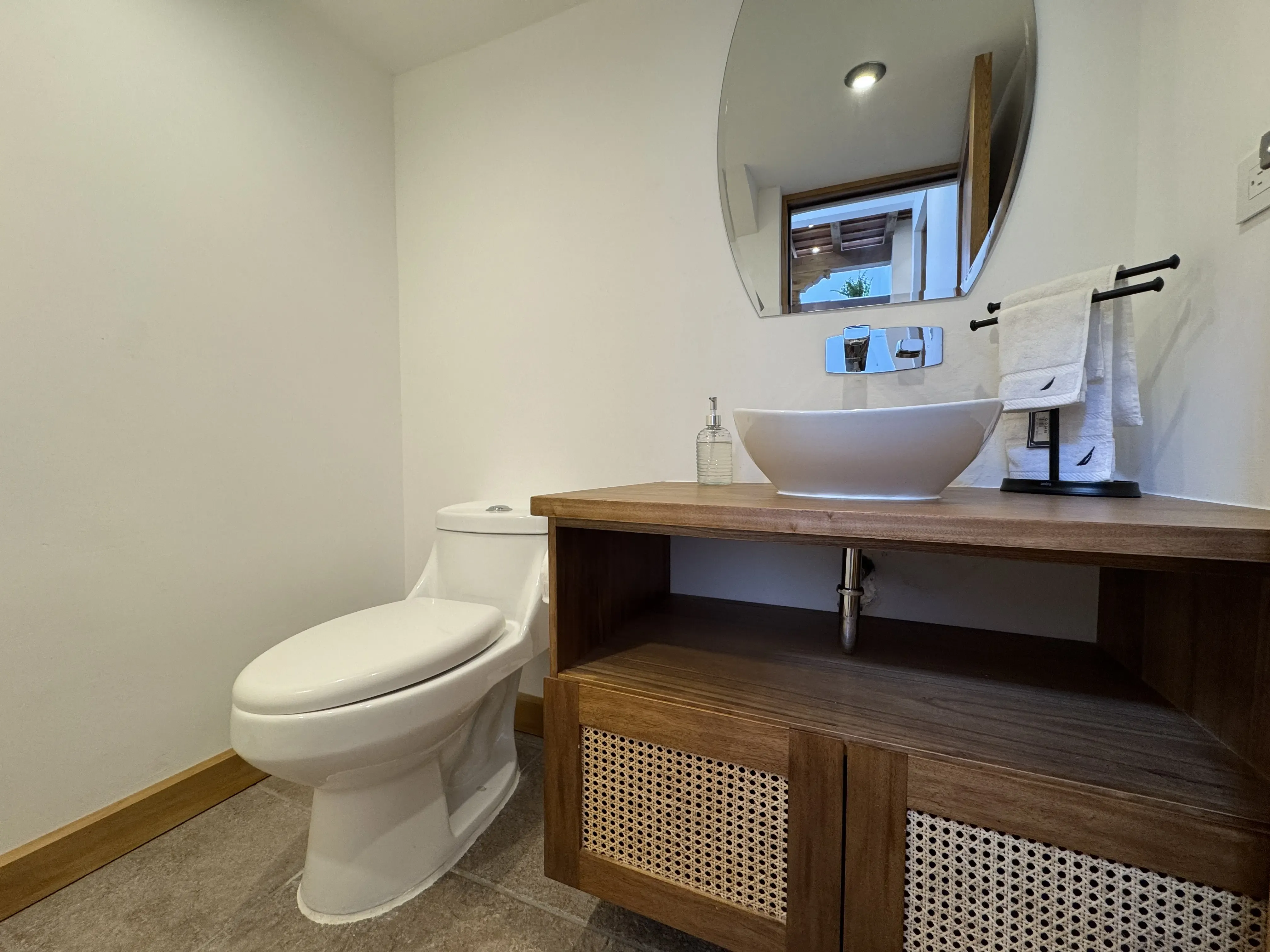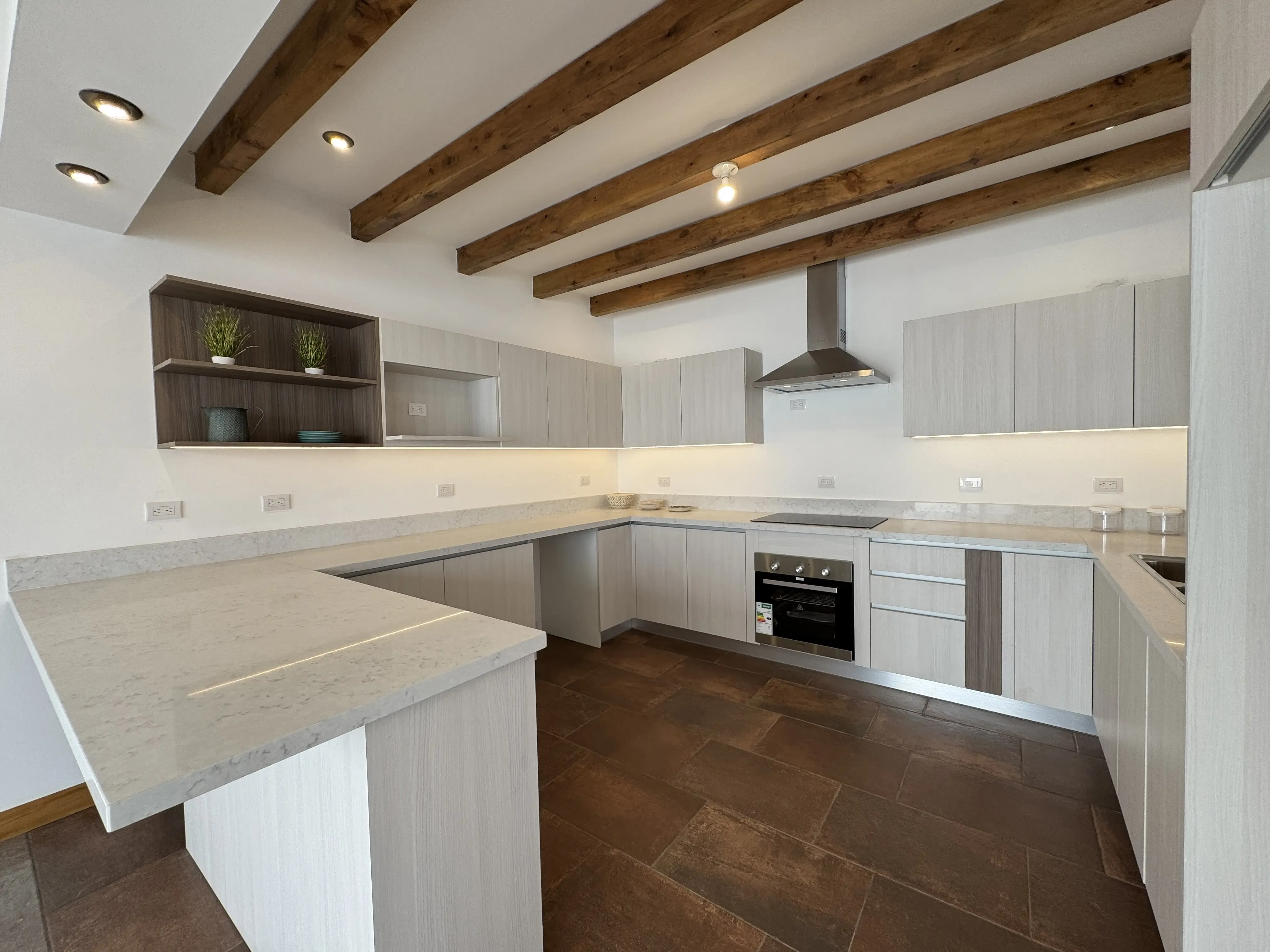 - Cocina: Equipada con gabinetes modernos, top de cuarzo resistente y campana extractora de humo.