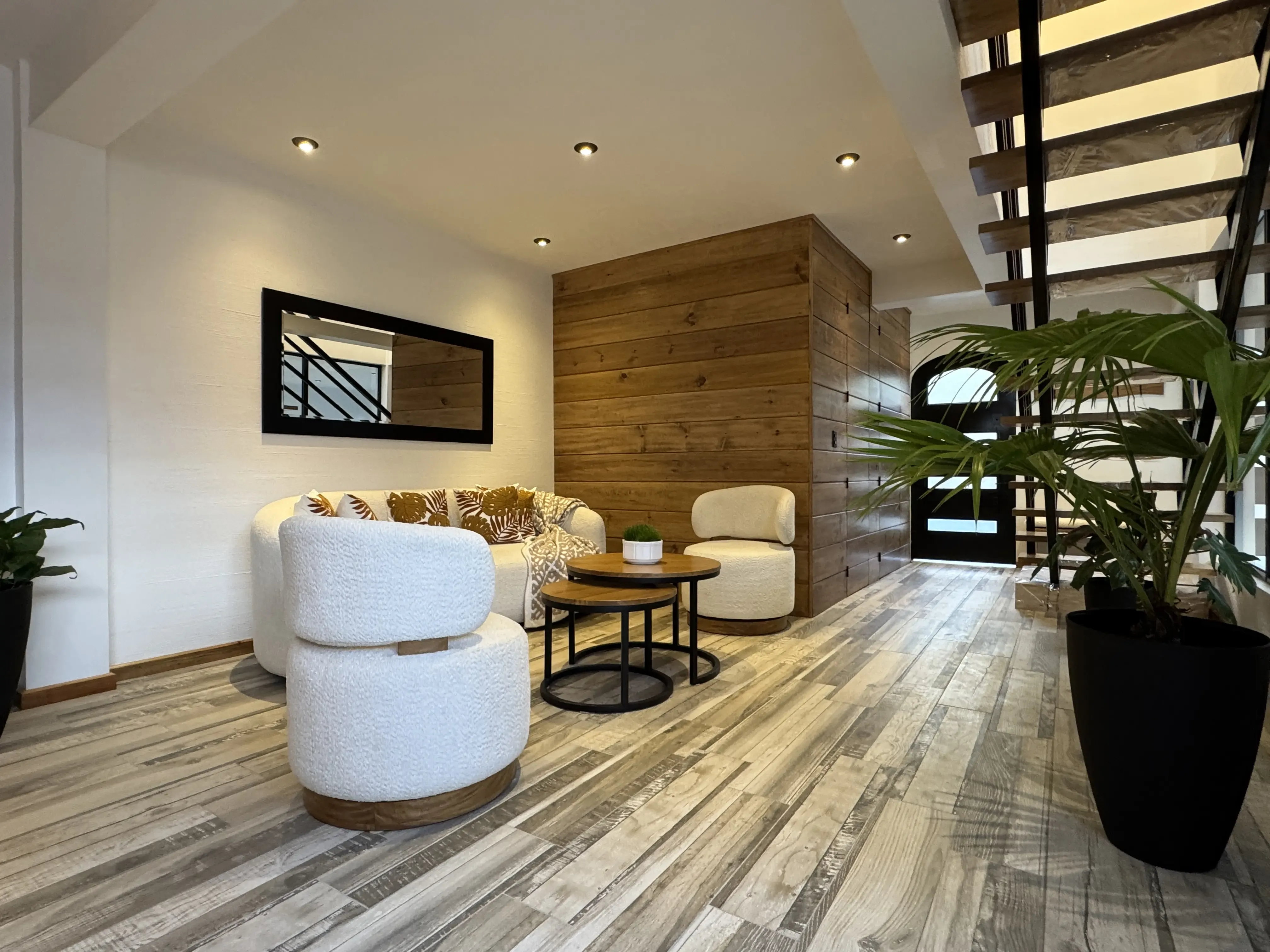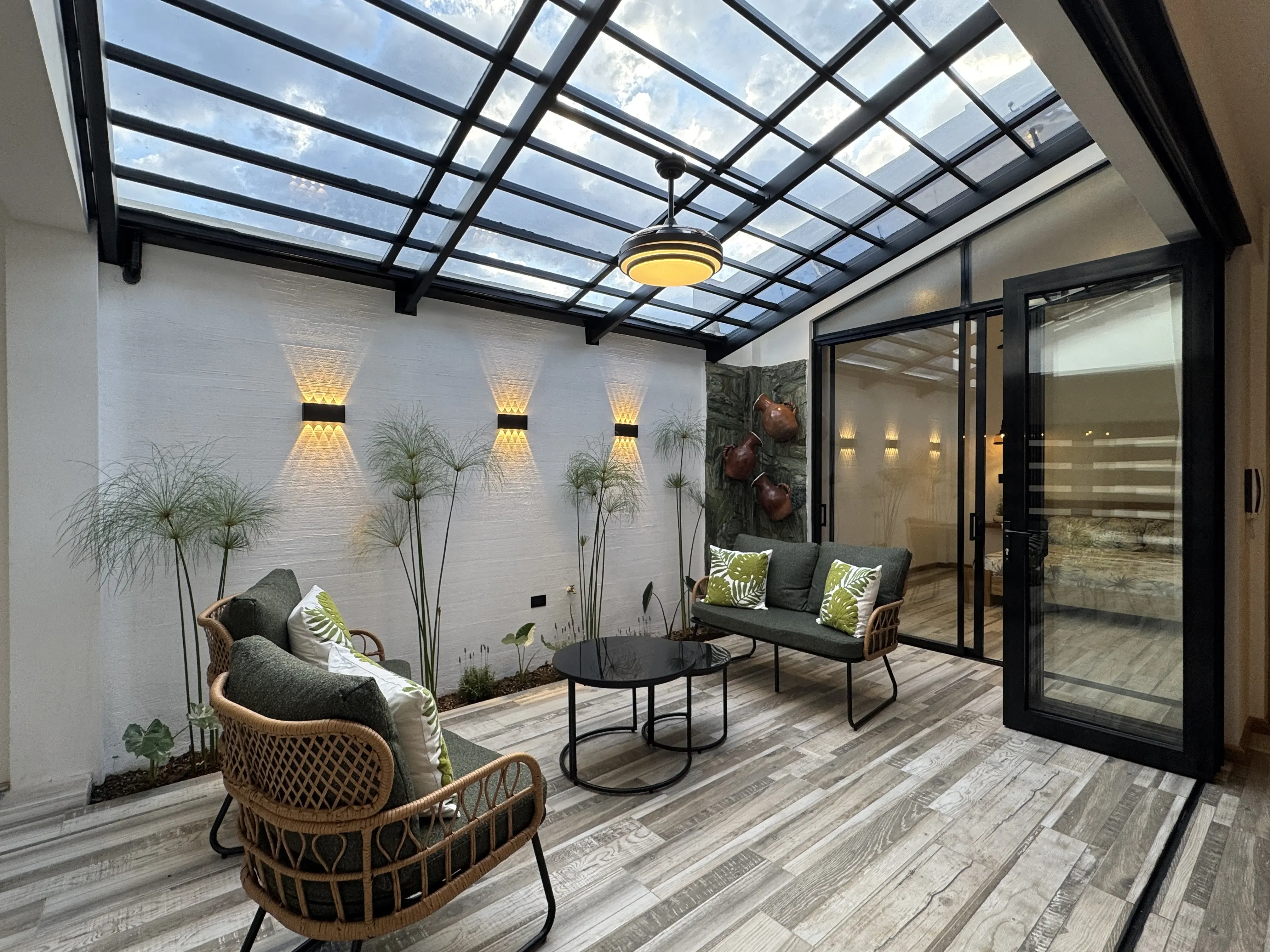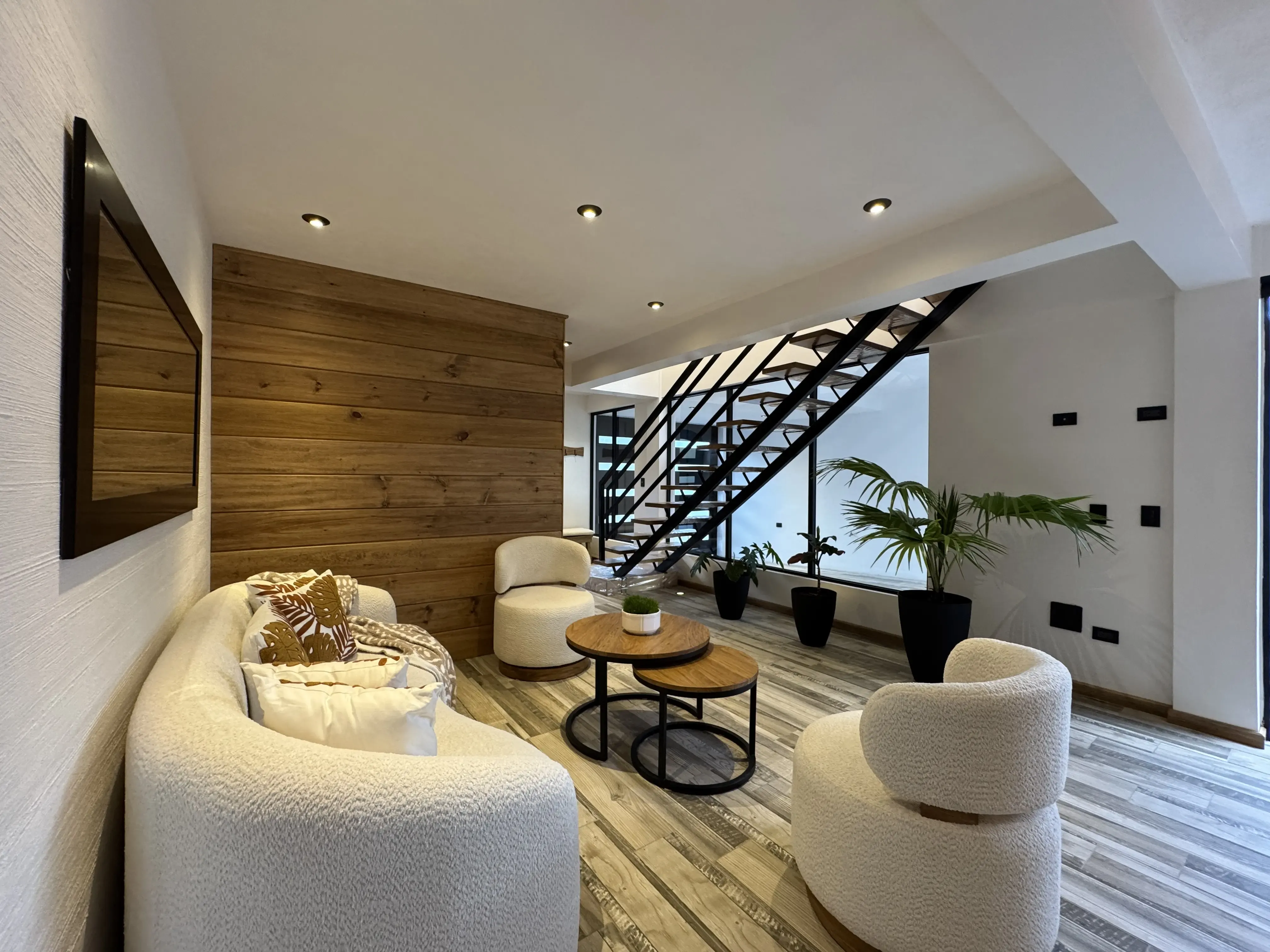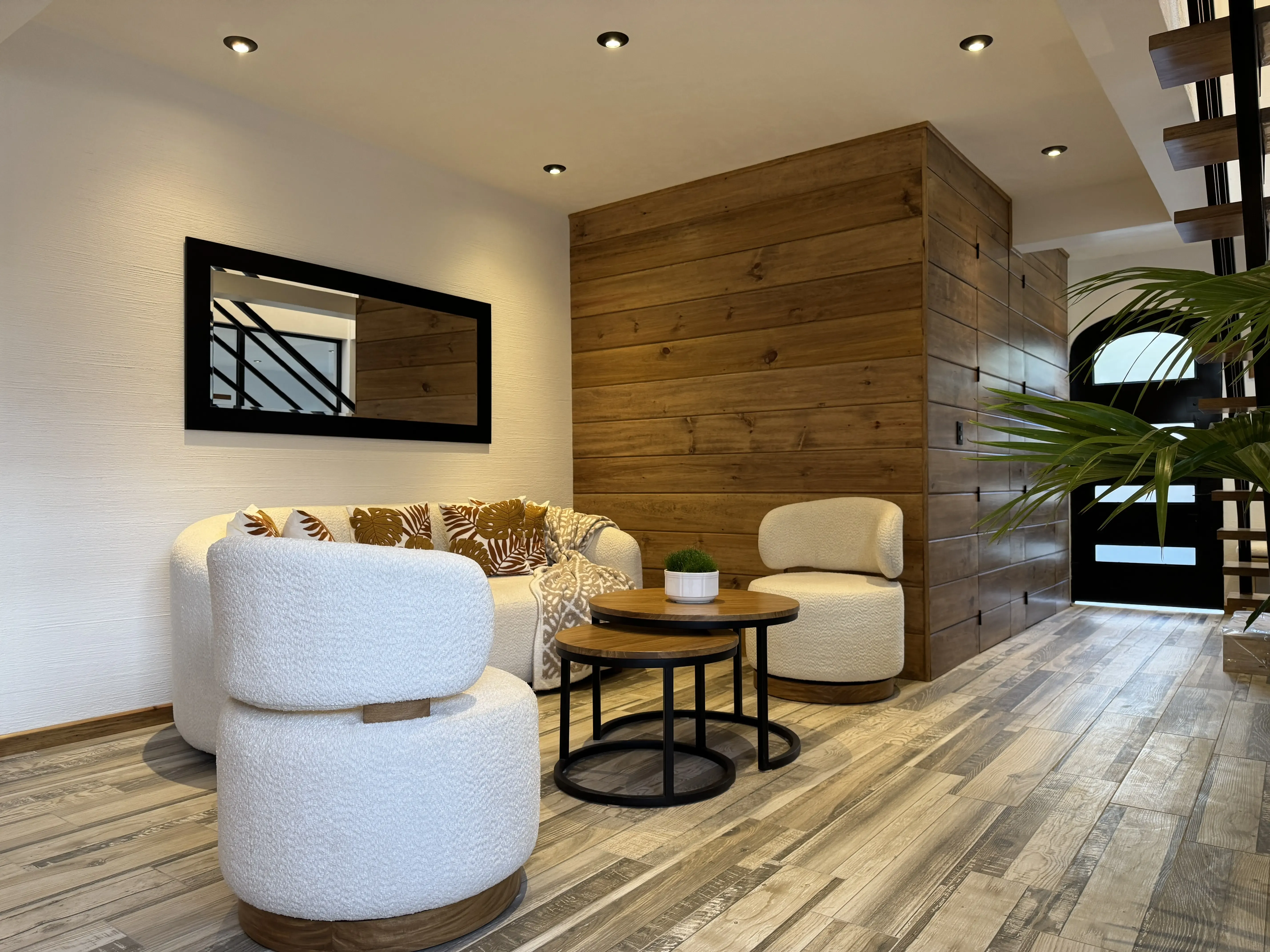 • Mobiliario funcional: Incluye mesa modular de madera adaptable (redonda o cuadrada).